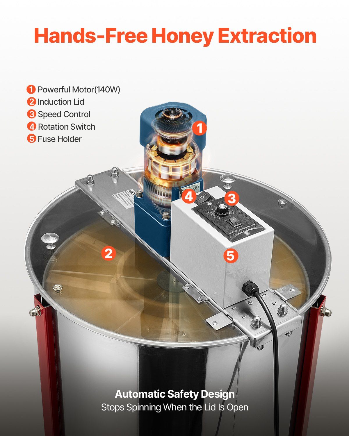 Conical Bottom & No Honey Left Behind: The honey spinner features patented sloped base design that directs honey naturally to the bottom, minimizing cleaning time and ensuring no residue. No need to tilt the machine, improving honey extraction efficiency.