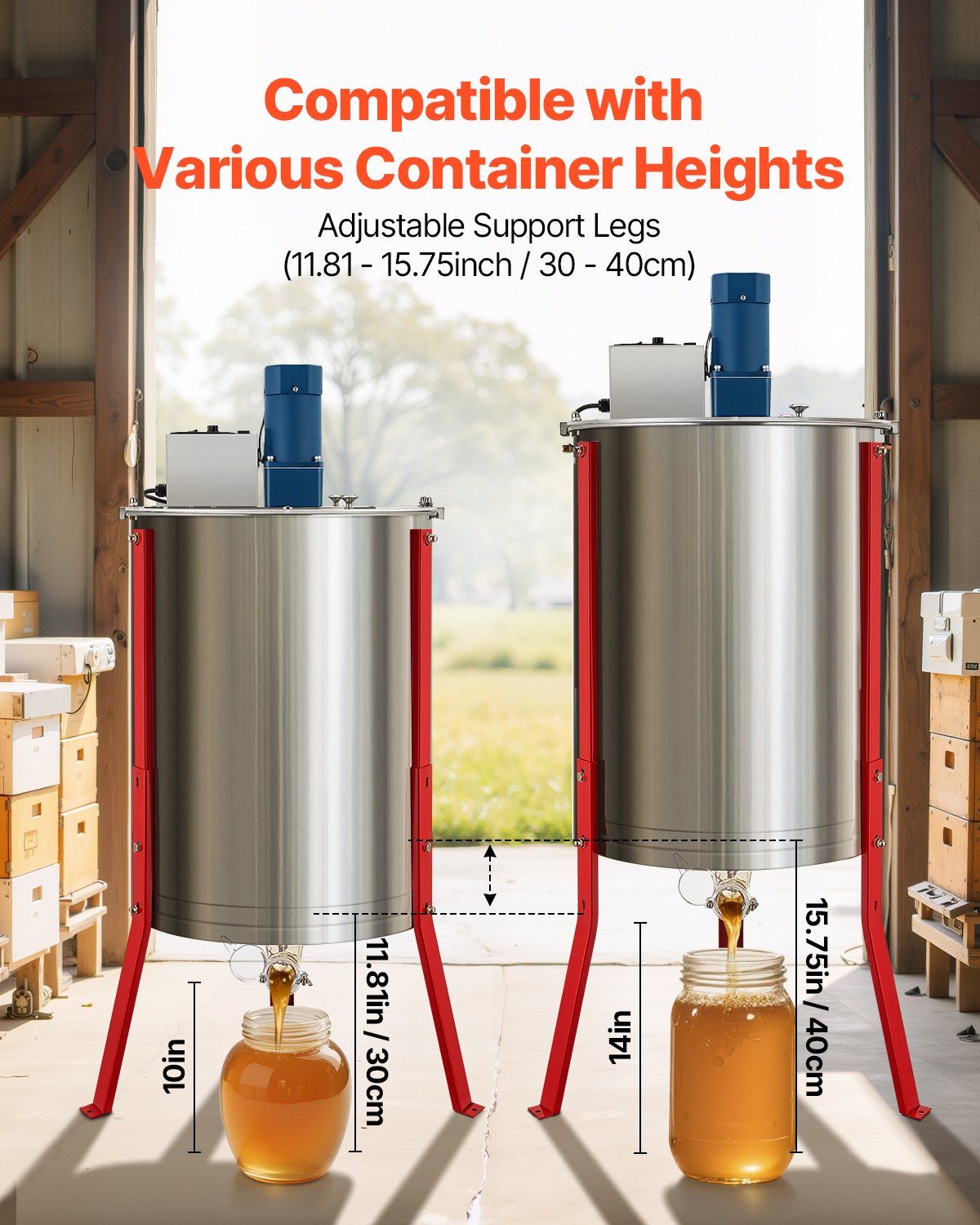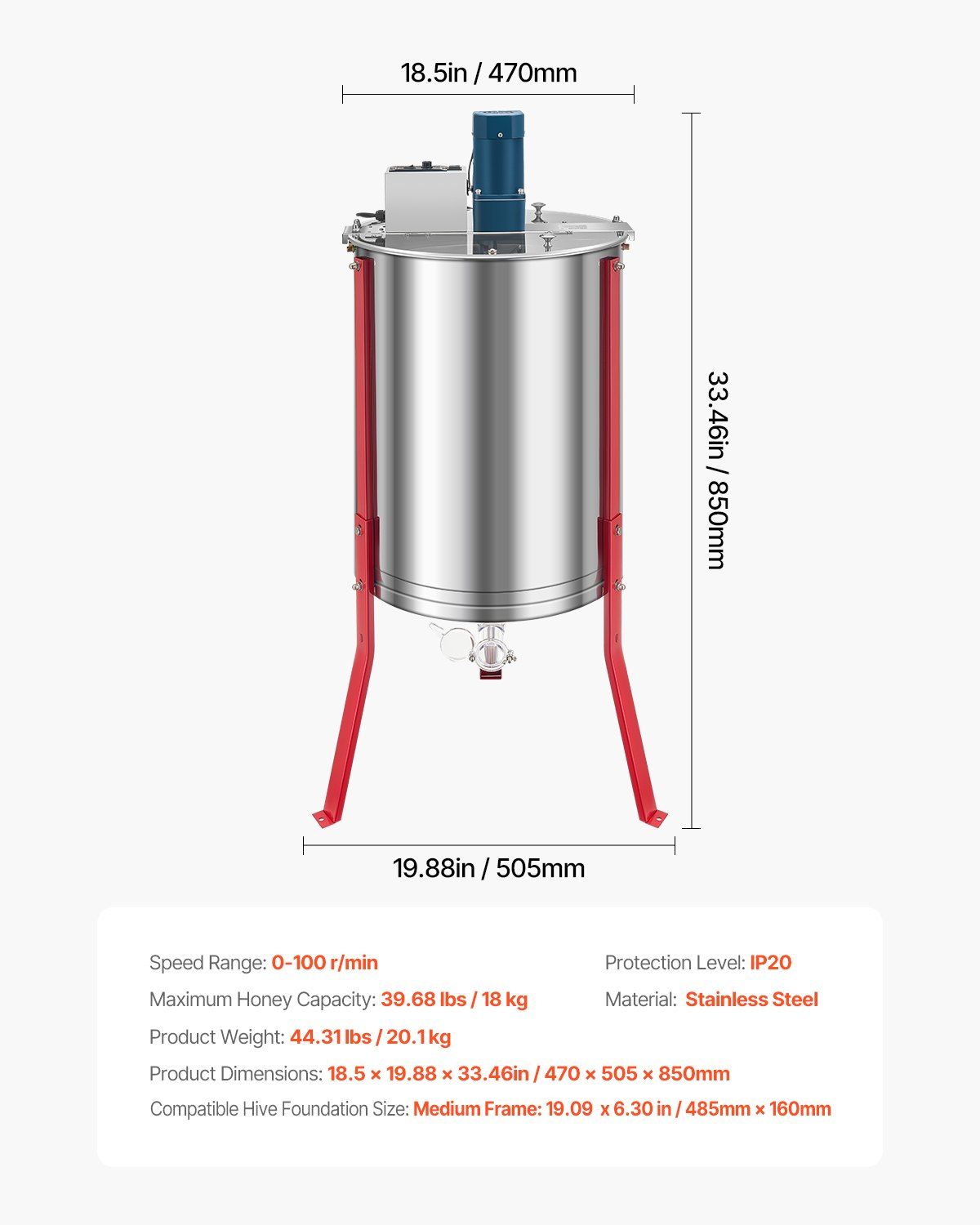 26-33.8 in Adjustable Height: The honey bee extractor comes with adjustable legs accommodate various workstations or surfaces. The ergonomic design reduces lower back strain, making it ideal for users between 1.5 to 1.88 meters tall, improving comfort during use.