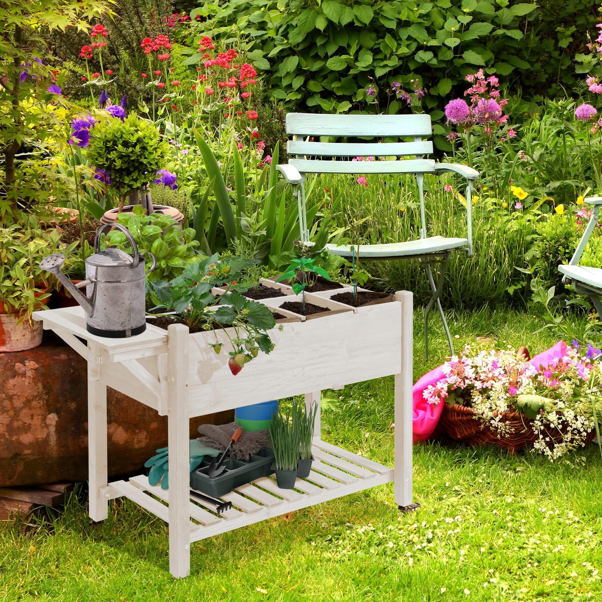 This raised garden bed planter box is a smart, space-saving solution for growing herbs, vegetables, or flowers right at home. It features eight organized grow grids to help separate plants, plus a convenient lower storage shelf for tools and supplies. Built-in lockable wheels make it easy to move the planter wherever your plants get the best sunlight. The elevated design reduces strain on your back while gardening and helps keep pests away. Durable construction ensures reliable outdoor use, making it ideal for patios, balconies, and small yards.