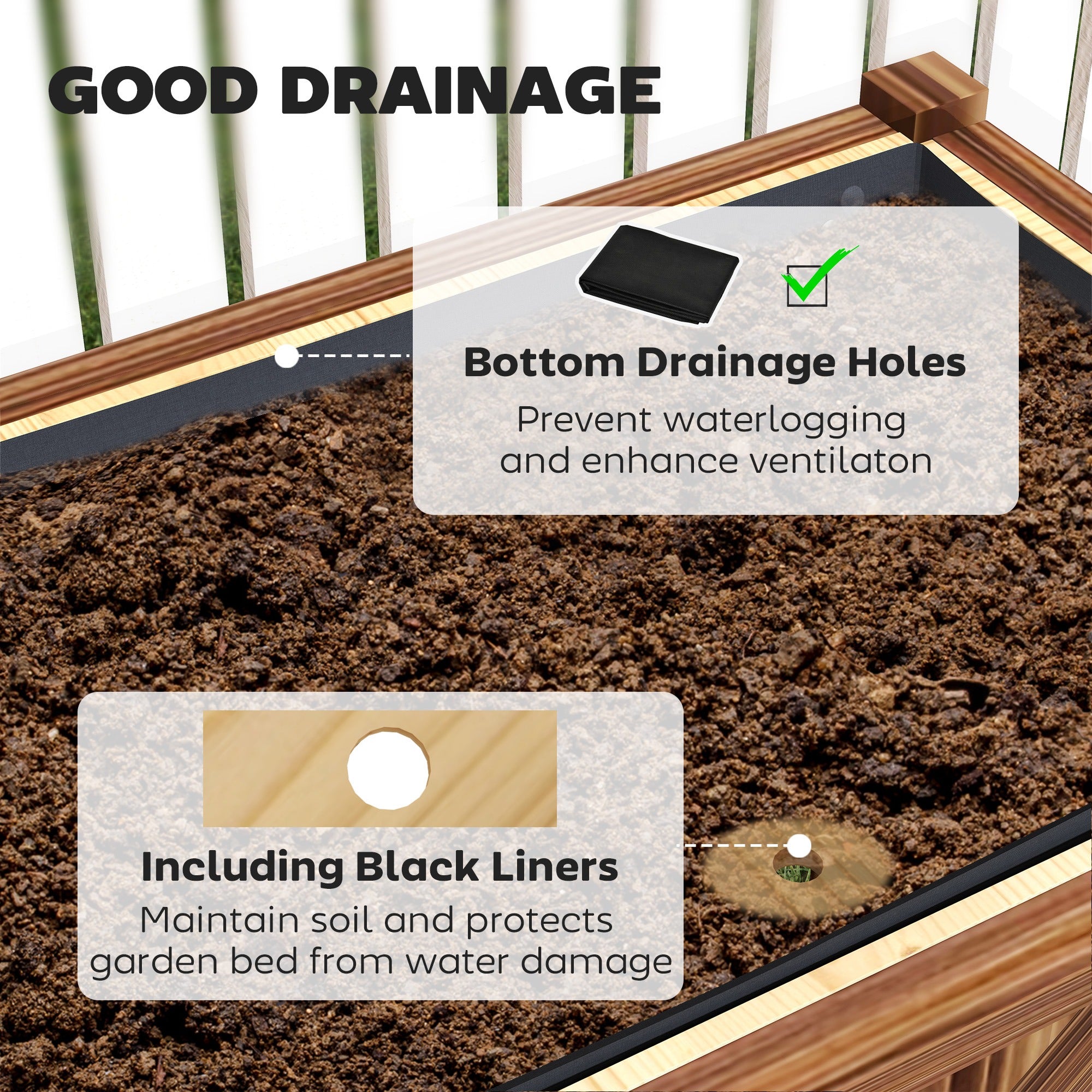This elevated wooden raised garden bed is a smart, space-saving solution for growing herbs, vegetables, or flowers right on your patio, balcony, or backyard. Crafted from durable wood, it features a comfortable working height that reduces bending and strain while gardening. Built-in drainage holes and an included liner help promote healthy root growth and proper water flow. A convenient lower storage shelf keeps tools, soil, or watering cans neatly organized and within reach. Stylish and practical, this planter box makes it easy to enjoy gardening in smaller outdoor spaces.