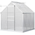 Ambitions for a longer growing season or a more bountiful harvest? Go with the greenhouse. Outsunny offers a heavy-duty polycarbonate greenhouse with a strong aluminum frame. Polycarbonate lets light in, insulates the interior, and stops plant scorching by blocking UV. The greenhouse has a sliding door for quick access and a roof window with 5 levels of adjustment for airflow control, and a sloped roof with rain gutters. The greenhouse sits on a galvanized base for stable support, and four foundation stakes are included. Extend your growing season with Outsunny.
