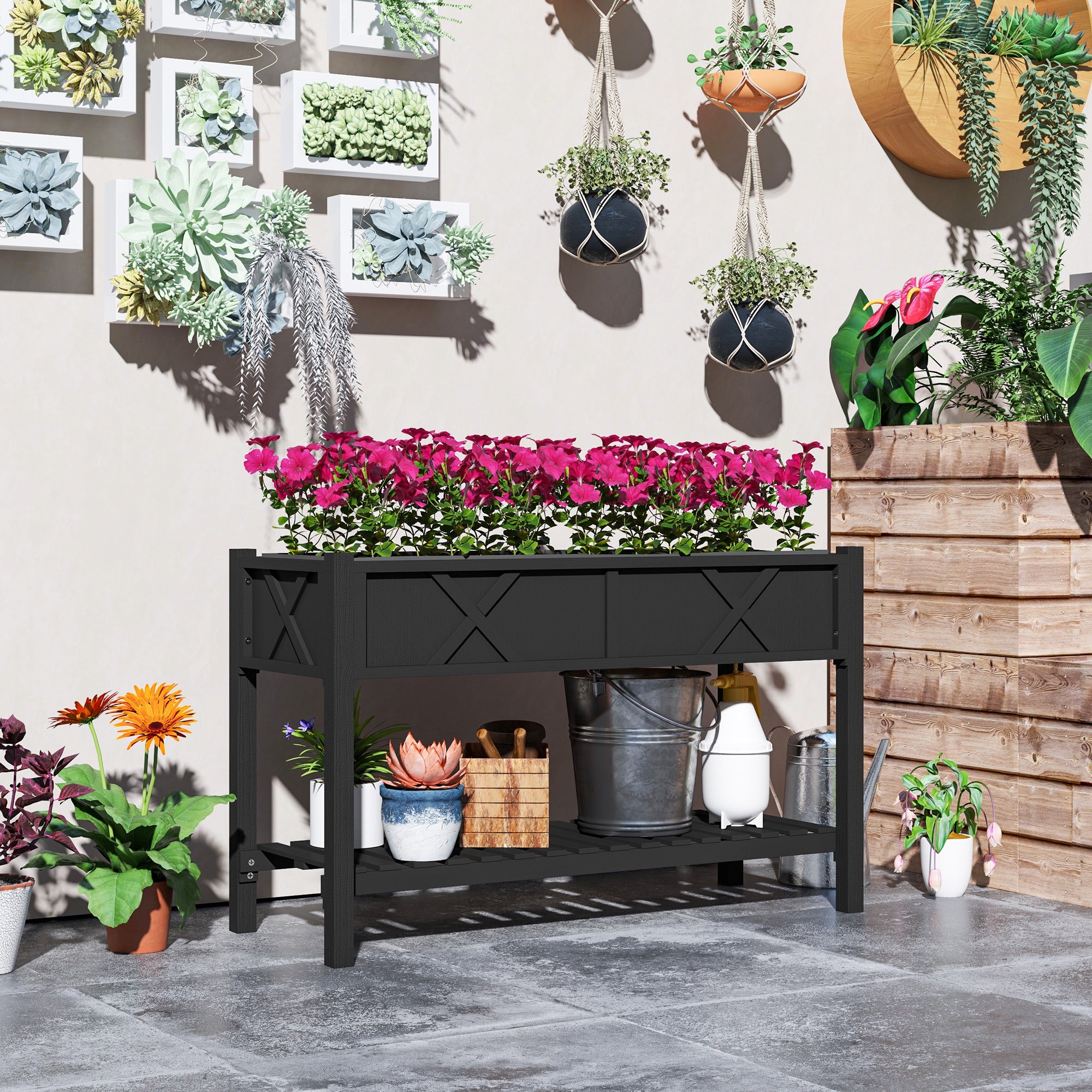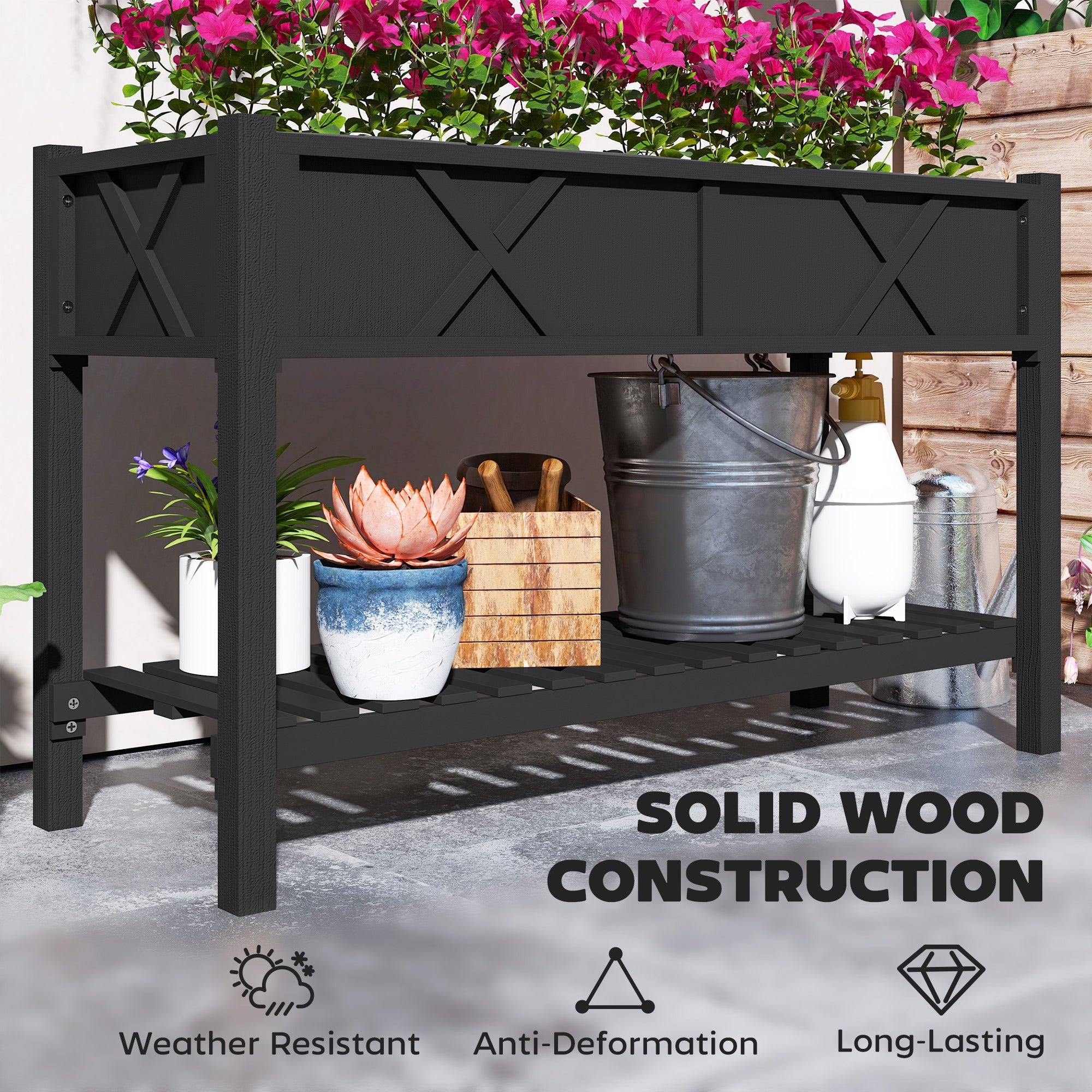 Two-tier design allows for planting on the table above and storing garden essentials such as pots and garden tools on the bottom shelf below