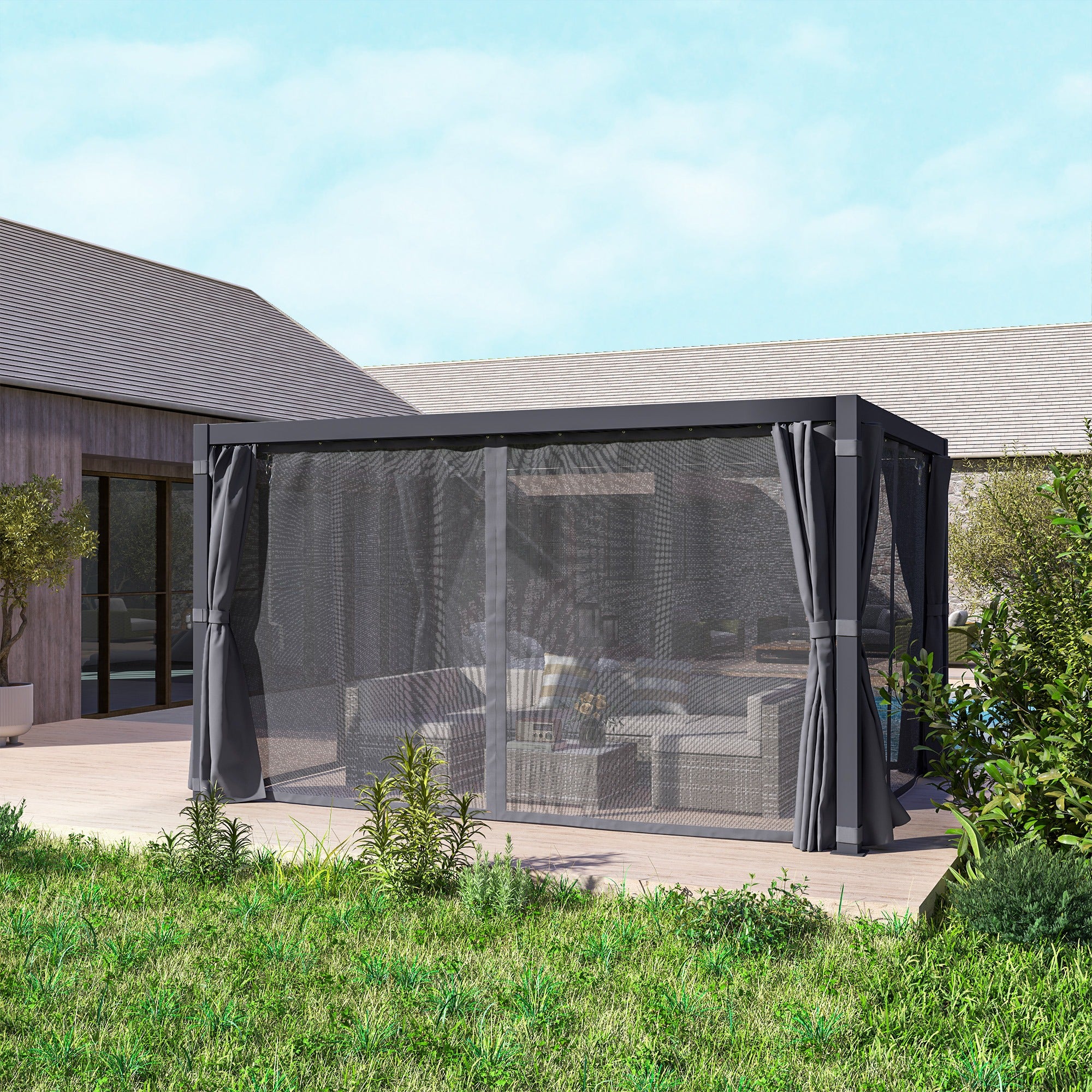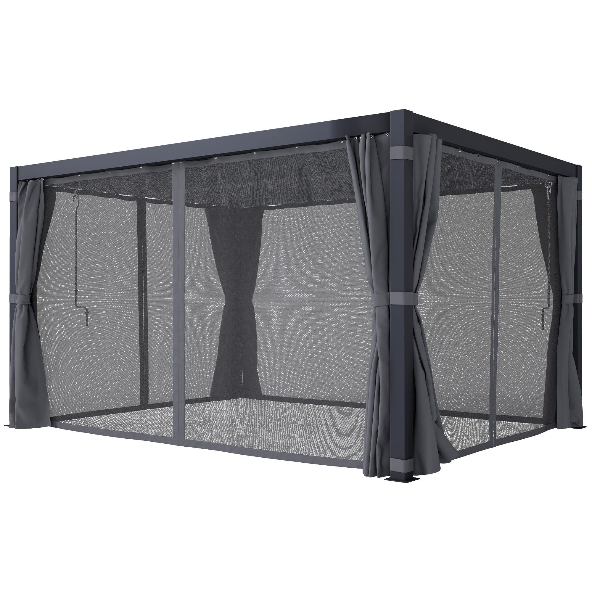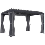 Create a stylish and comfortable outdoor retreat with the Outsunny 10' x 13' Outdoor Retractable Pergola. Designed with a durable aluminum frame and a sleek dark gray finish, this pergola adds modern elegance to any patio or backyard. The louvered sunshade canopy lets you control sunlight and airflow, while the included curtains and mesh netting provide added privacy and protection from insects. Perfect for entertaining guests or relaxing outdoors, it offers generous coverage for outdoor gatherings. Built for both function and style, this pergola will be the heart of your outdoor space.