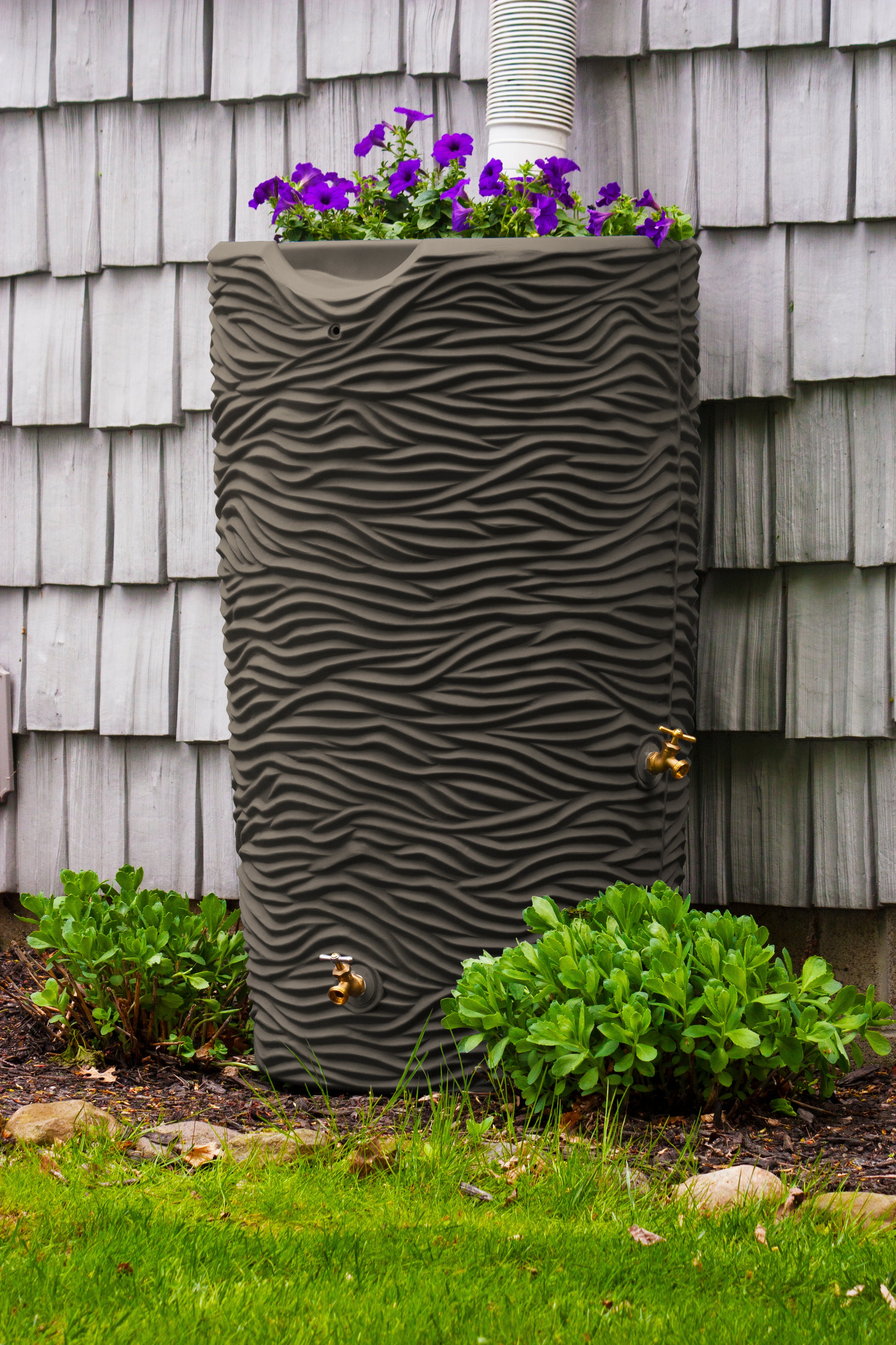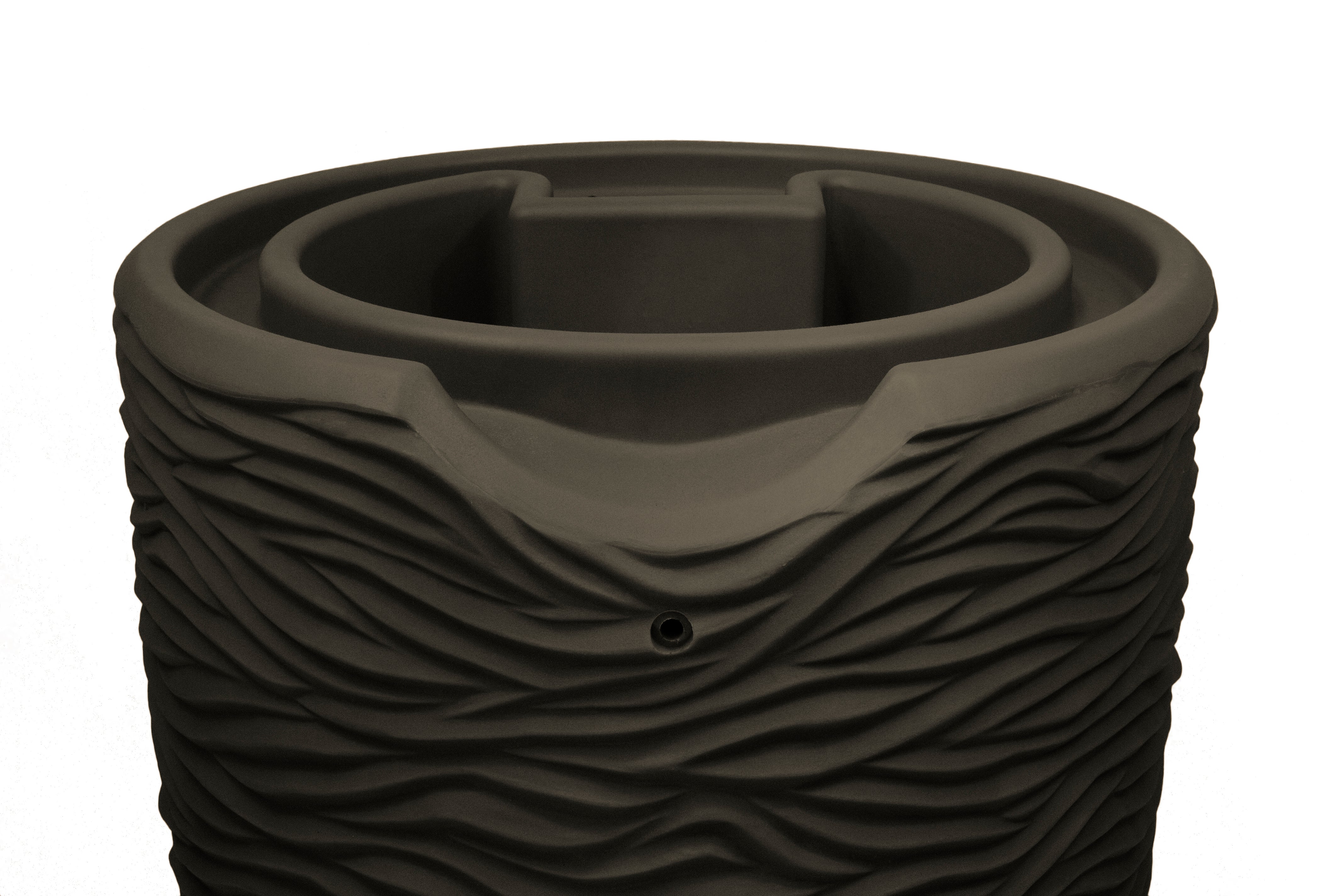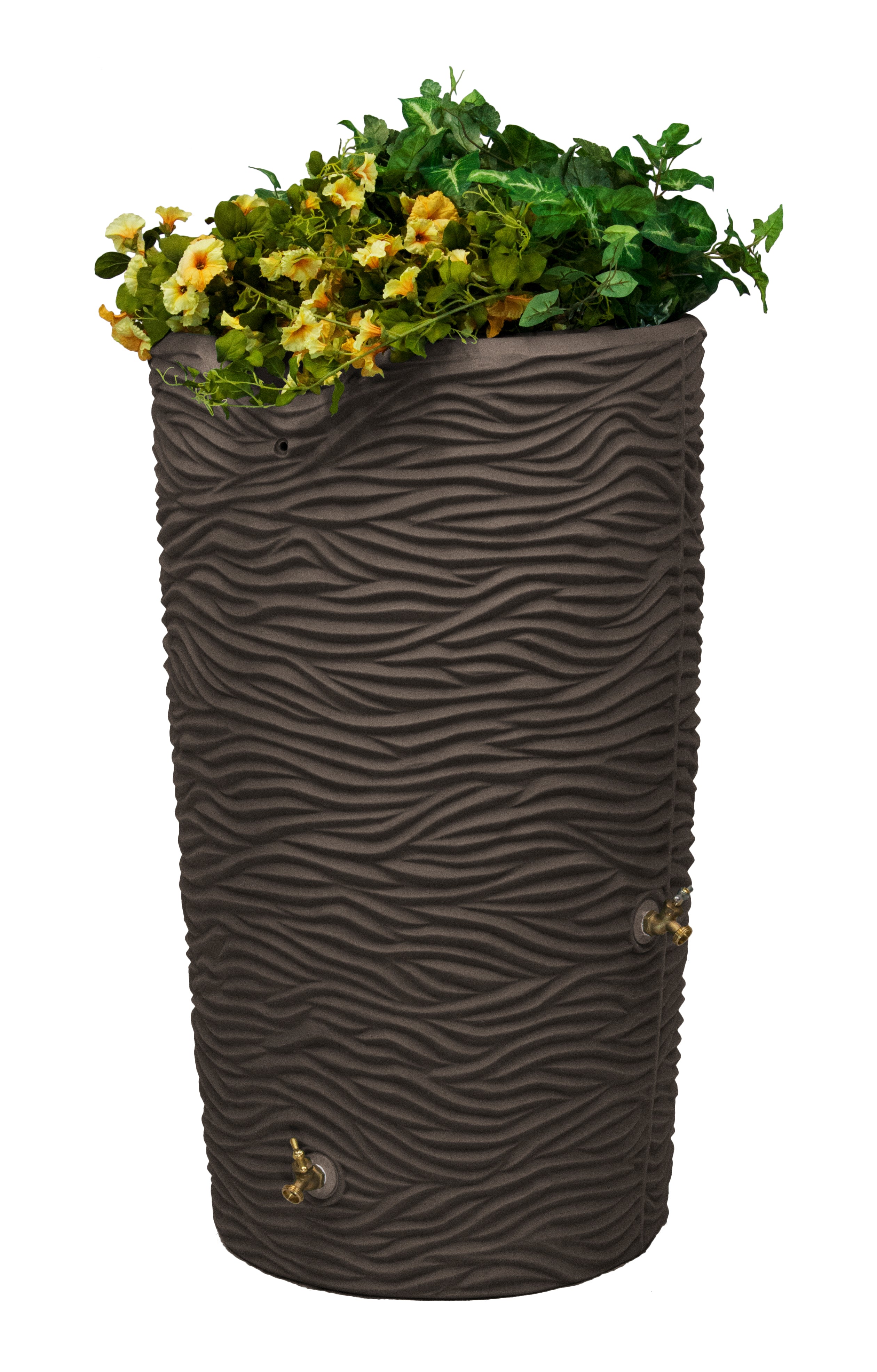 The Impressions Palm 65 Gallon Rain Saver is one of the sturdiest and most eye-catching rain barrels on the market. Its appearance emulates the rough texture of a palm tree trunk, and with a deep welled top, you can plant an array of flowers or even a small herb or vegetable garden. The top also includes the Good Ideas original, integrated channel that automatically diverts overflow to the front of the barrel and keeps your foundation from flooding. The large opening can be used for 2x3 or 3x4 downspouts and is covered with a soft, fine mesh, plastic screen that keeps out heavy debris. Also included with the barrel are two sturdy brass spigots to install in the offset spigot locations.