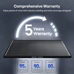 - Long-Term Reliability: Backed by a 5-year warranty on materials and craftsmanship and a 25-year output guarantee ensuring at least 80% power output, this panel is built to last.