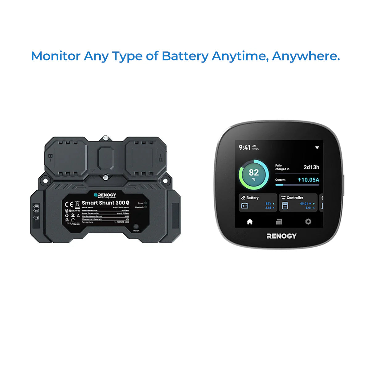 Renogy Smart Shunt 300 is an intelligent battery monitor that measures the battery voltage and current based on which it calculates the state of charge (SOC) and remaining running time of the battery.