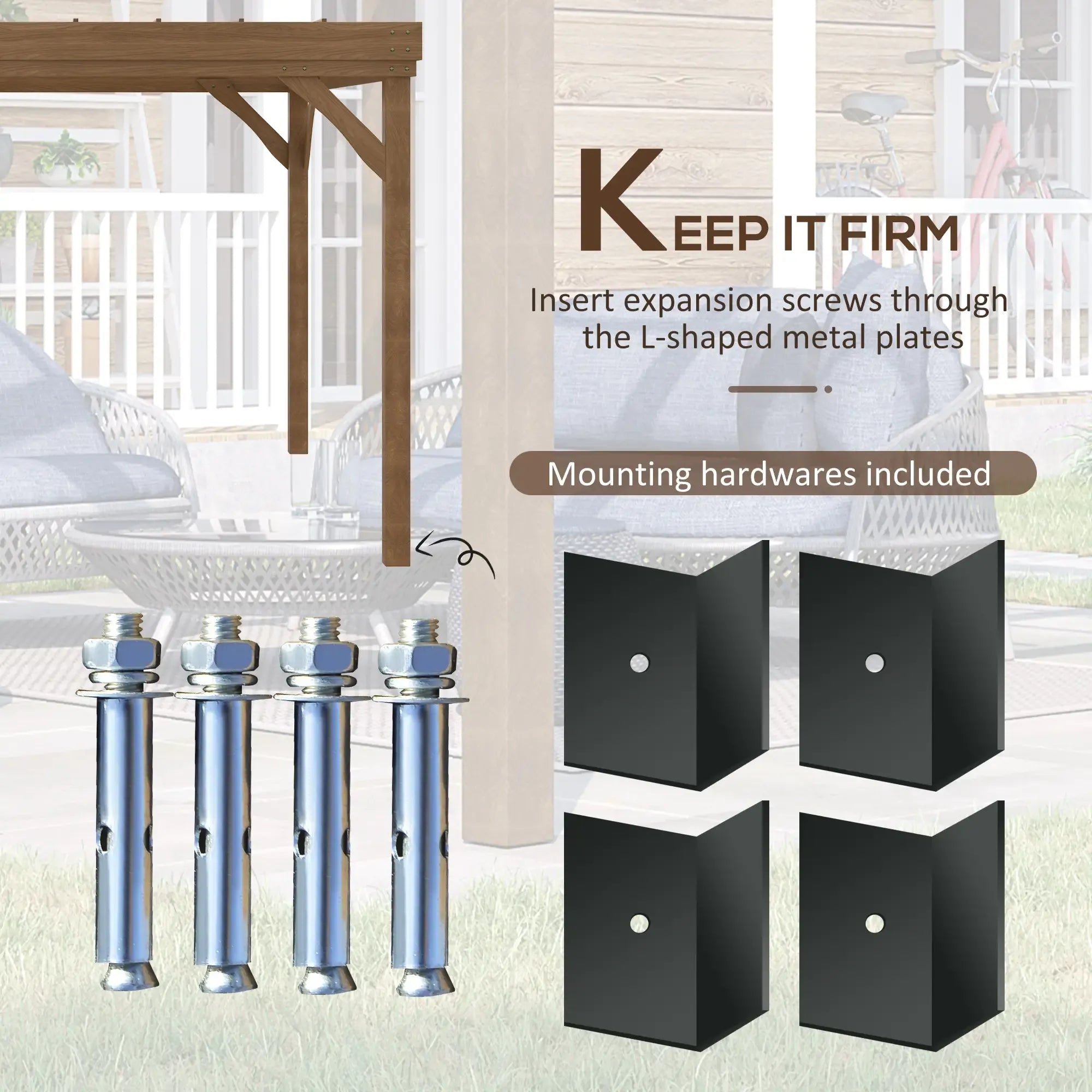 Expansion screws and metal plates included to mount your pergola to hard ground