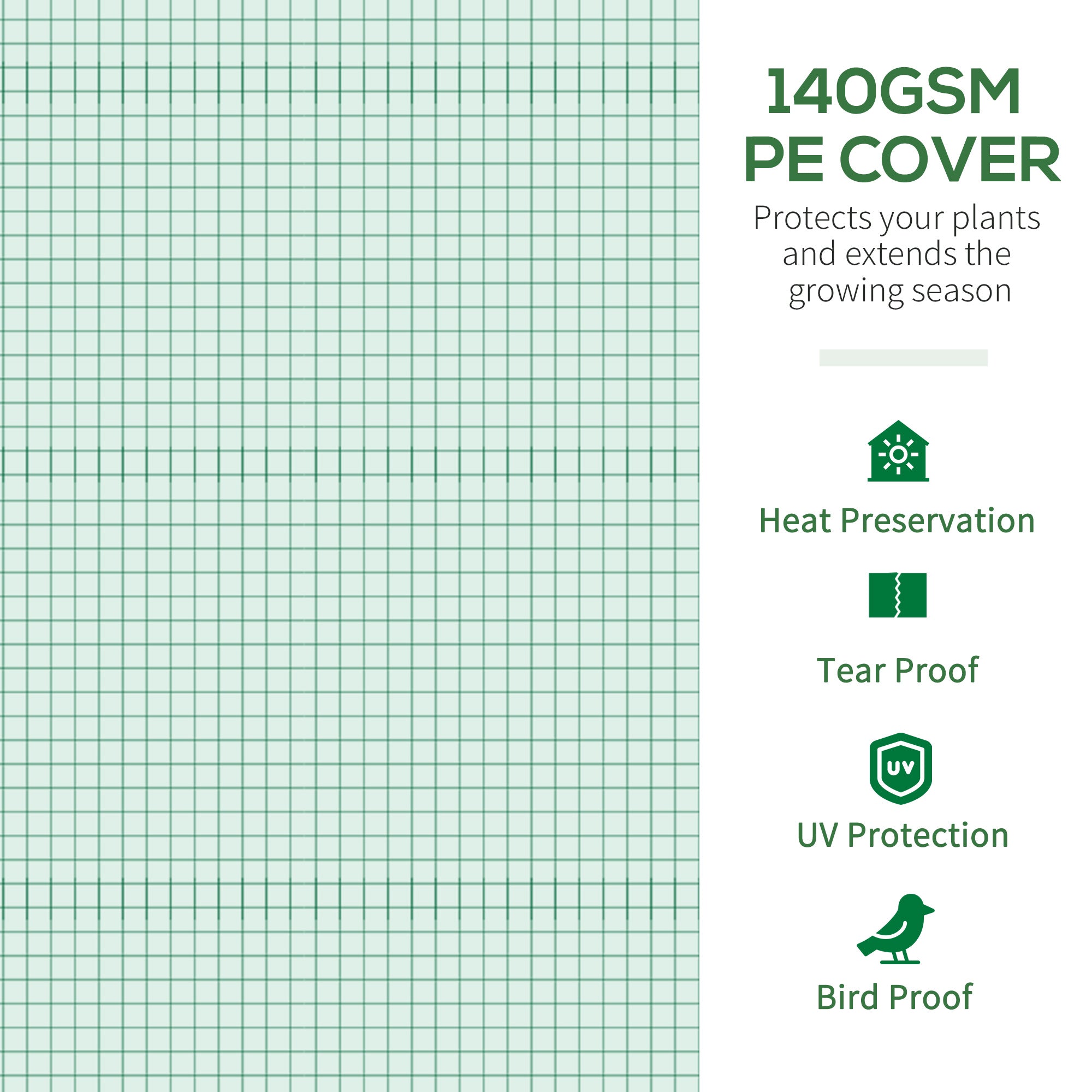 • Heavy Duty PE Cover: The 140gsm PE cover includes a reinforcement grid and polyester seam. The strong cover shields plants from scorching UV radiation while allowing 85% of sunlight through, keeping your plants nourished and protected.