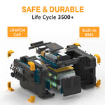 - SAFETY & DURABLE: The ultra-safe LiFePO4 battery with Built-in BMS assures the self-protection of short circuits, overload, and overheating. 110V Pure-sine wave inverter makes sure there is no damage to your sensitive electronic devices.